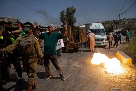 A sound grenade is fired by Israeli forces during a protest against the creation of a new road for Israeli settlers, near the Palestinian village of Beita, north of the West Bank city of Nablus, Wednesday, Aug. 25, 2021. (AP Photo/Majdi Mohammed)